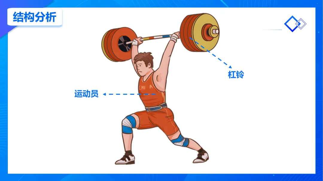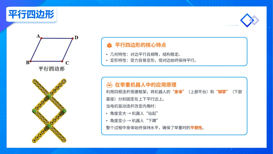 课堂上,孩子了解了举重运动的规则,区分了抓举和挺举的不同动作,感受到了这项运动的力量与技巧。同时,我们结合几何知识,讲解了平行四边形的特性,并引导孩子运用该原理,搭建出能平稳“举重”的机器人连杆结构,理解其如何保证机器人运动时的水平稳定。