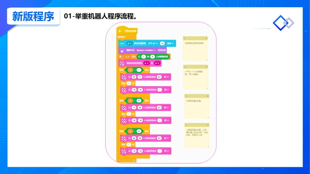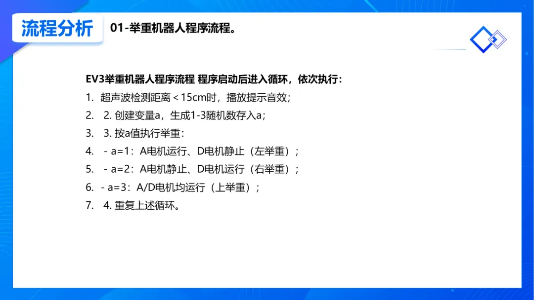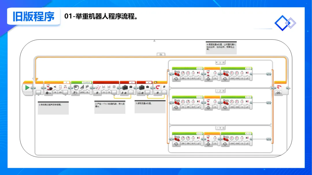 编程环节,孩子掌握了EV3循环程序的编写,学会运用超声波检测、随机数变量及电机控制,实现机器人根据随机指令完成左、右、上三种举重动作。