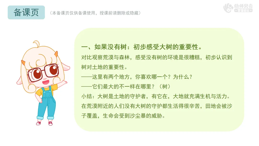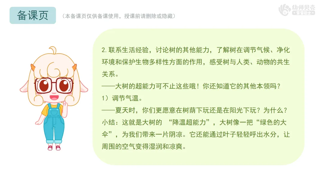 l重点:探索和感受树木的多种重要作用,萌发热爱树木、感激自然的情感。