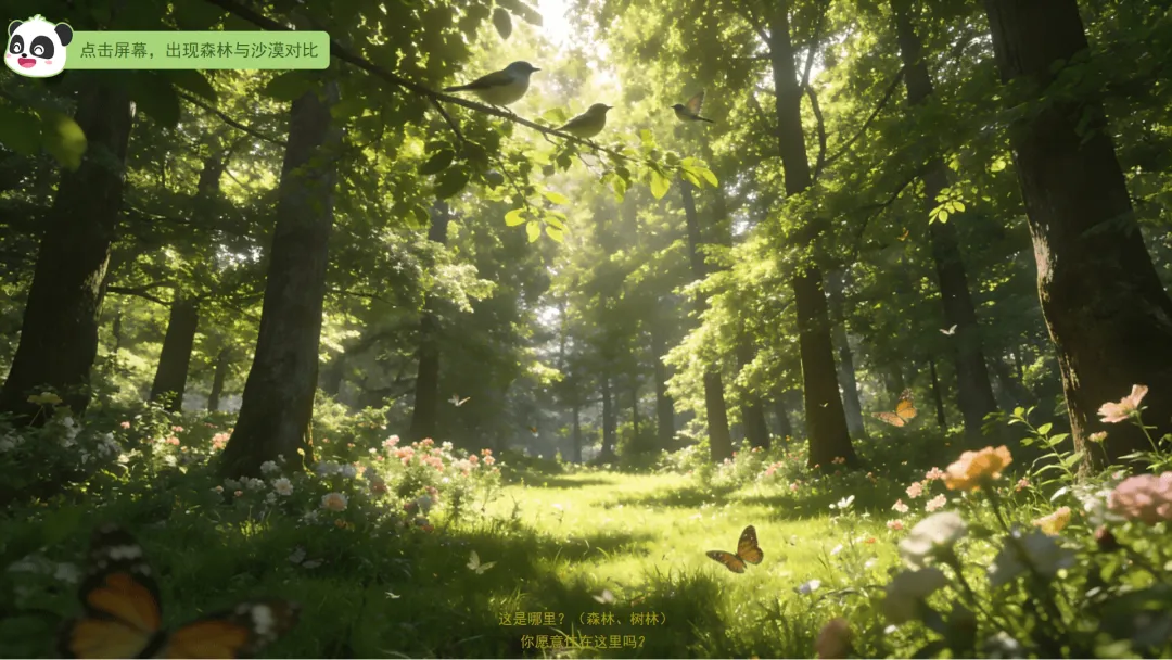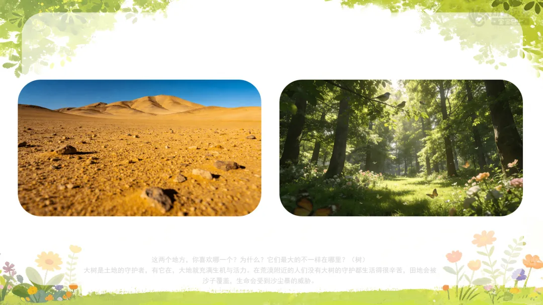 对比观察荒漠与森林,感受没有树的环境是很糟糕,初步认识到树对土地的重要性。