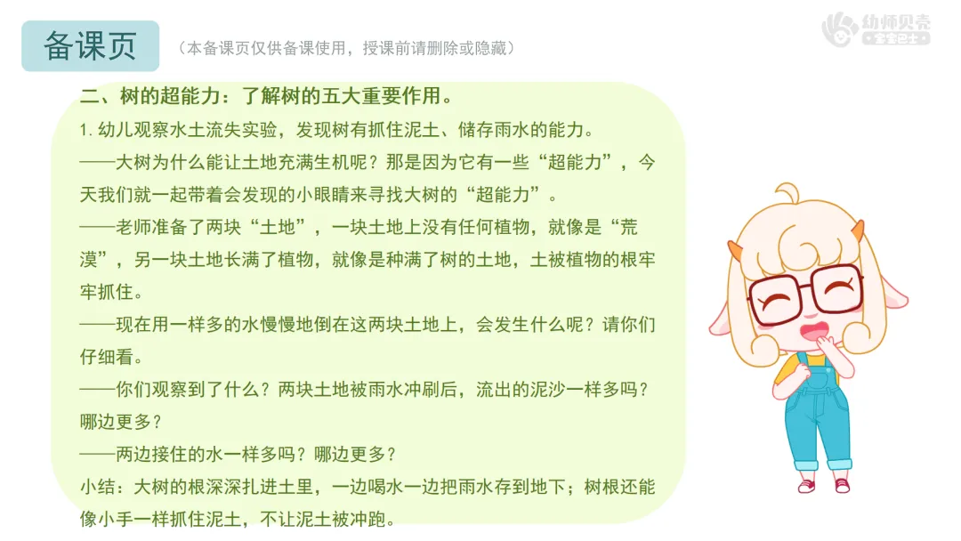 l难点:理解树木能固土蓄水、净化空气等抽象作用,愿意从身边小事做起保护树木。