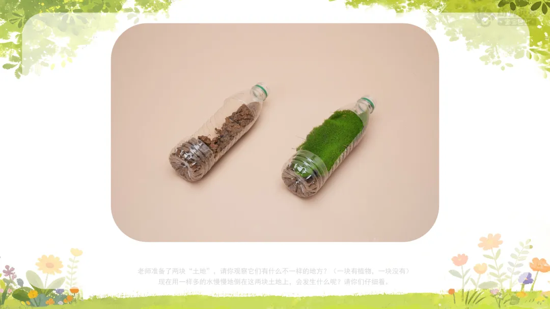 l材料准备:1.装有土的塑料瓶、装有土和植被的塑料瓶:可以准备两个相同的塑料瓶,将瓶子的中间部分镂空一半,分别填入等量的土,并在其中一个瓶子铺上带根的一小块草,或是仿真草皮。2.接水容器:尽量使用大小一样,或有刻度的杯子,便于在实验结束后,观察比较水与土的多少。3.装水容器:装水容器用于模拟下雨情境,因此也同样尽量使用大小一样,或有刻度的杯子,便于控制水量。