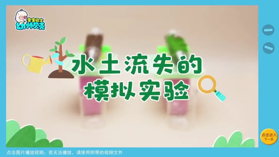 1.幼儿观察水土流失实验,发现树有抓住泥土、储存雨水的能力。