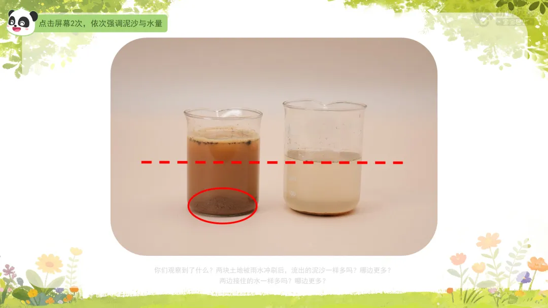 ——你们观察到了什么?两块土地被雨水冲刷后,流出的泥沙一样多吗?哪边更多?