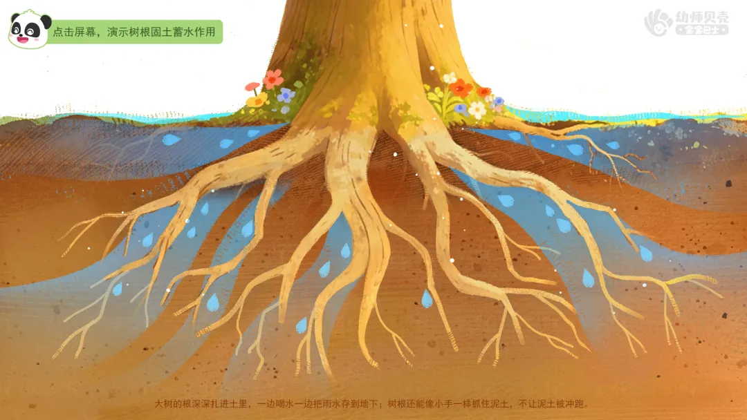 小结:大树的根深深扎进土里,一边喝水一边把雨水存到地下;树根还能像小手一样抓住泥土,不让泥土被冲跑。