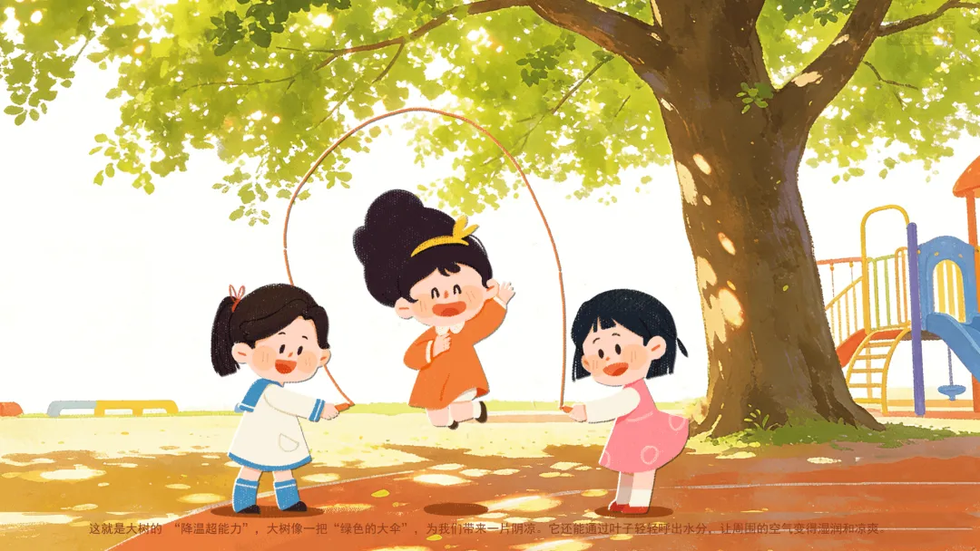 小结:这就是大树的 “降温超能力”,大树像一把“绿色的大伞”,为我们带来一片阴凉。它还能通过叶子轻轻呼出水分,让周围的空气变得湿润和凉爽。