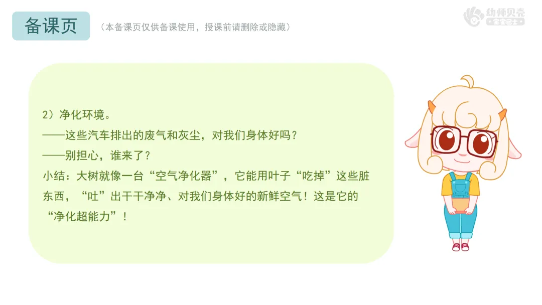 小结:大树就像一台“空气净化器”,它能用叶子“吃掉”这些脏东西,“吐”出干干净净、对我们身体好的新鲜空气!这是它的“净化超能力”!