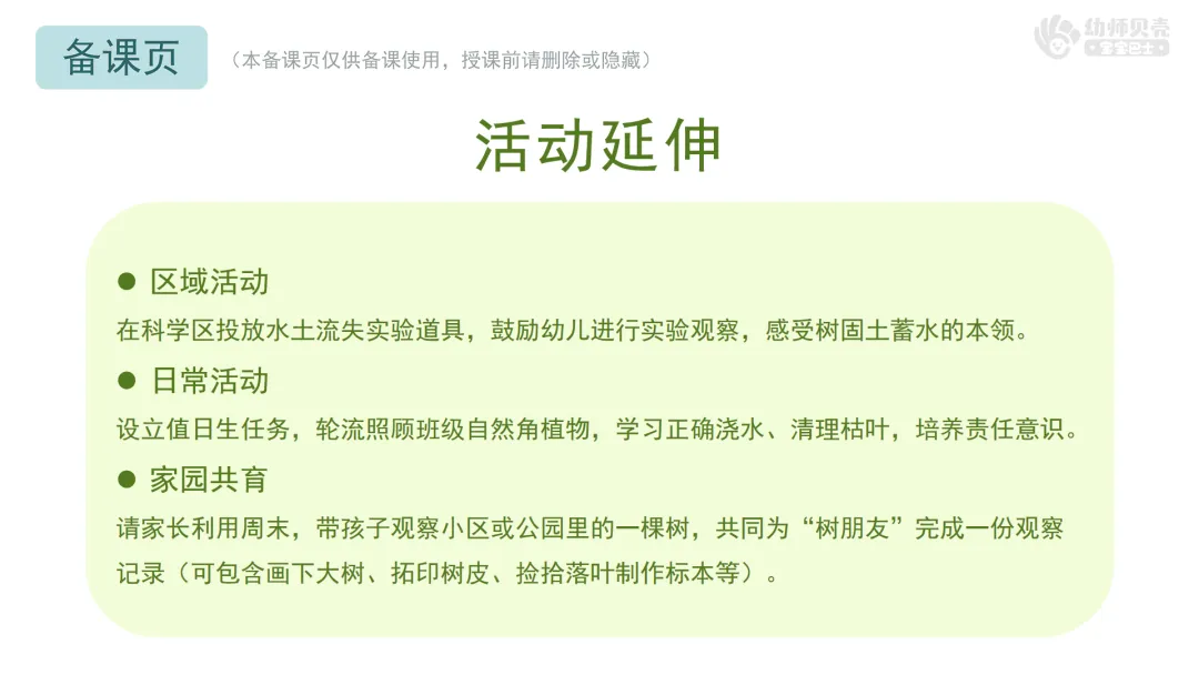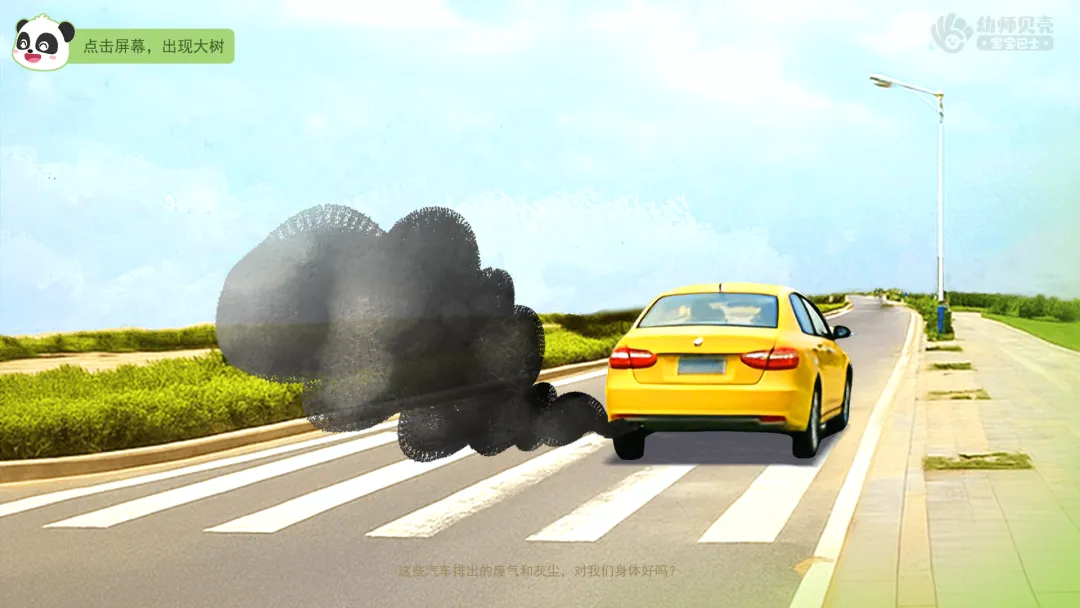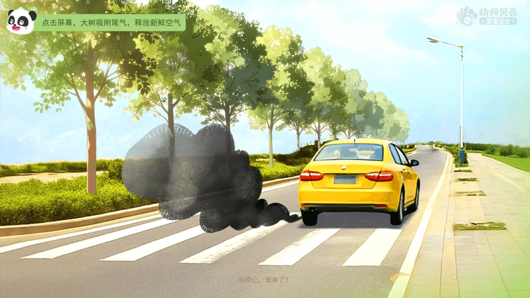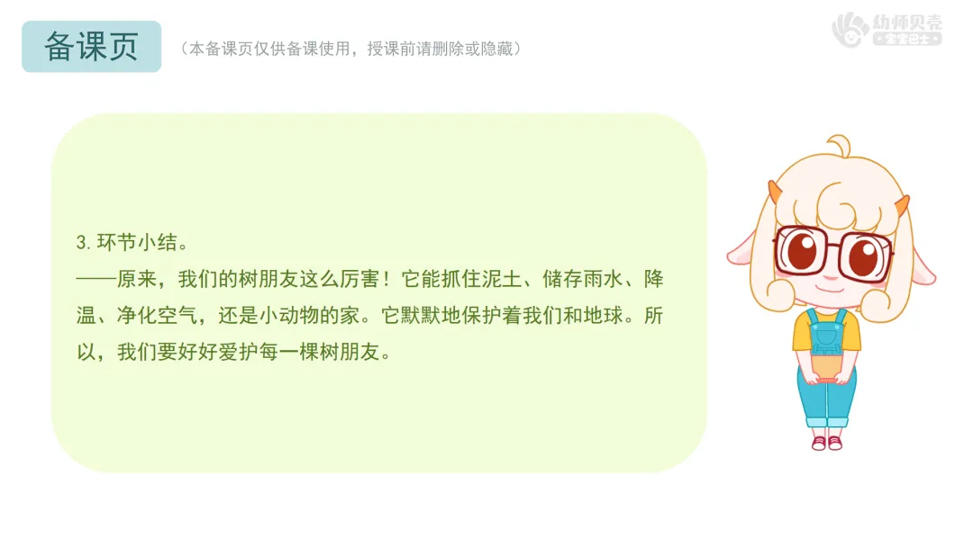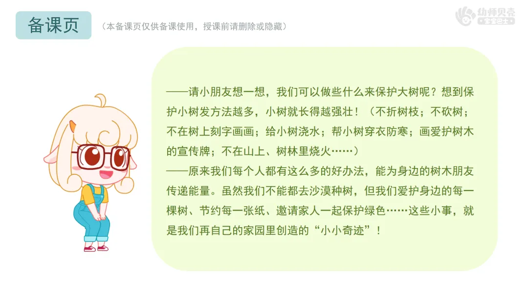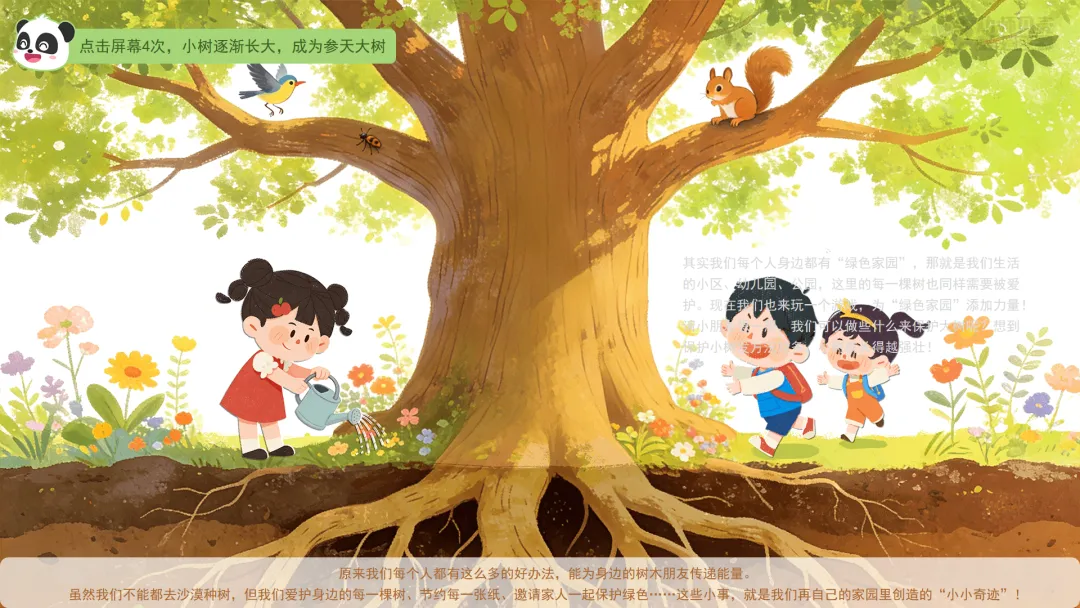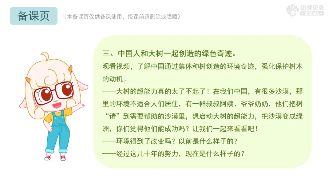 ——其实我们每个人身边都有“绿色家园”,那就是我们生活的小区、幼儿园、公园,这里的每一棵树也同样需要被爱护。现在我们也来玩一个游戏,为“绿色家园”添加力量!
