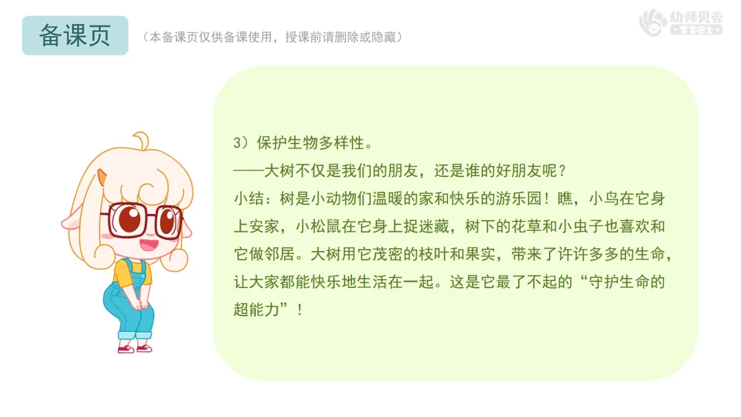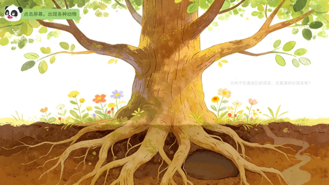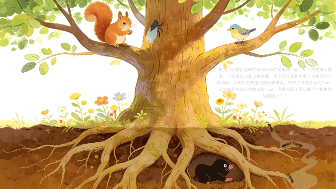 小结:树是小动物们温暖的家和快乐的游乐园!瞧,小鸟在它身上安家,小松鼠在它身上捉迷藏,树下的花草和小虫子也喜欢和它做邻居。大树用它茂密的枝叶和果实,带来了许许多多的生命,让大家都能快乐地生活在一起。这是它最了不起的“守护生命的超能力”!