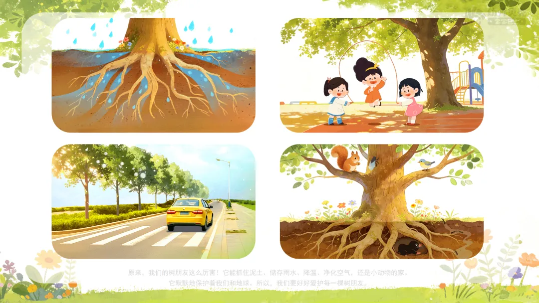 ——原来,我们的树朋友这么厉害!它能抓住泥土、储存雨水、降温、净化空气,还是小动物的家。它默默地保护着我们和地球。所以,我们要好好爱护每一棵树朋友。