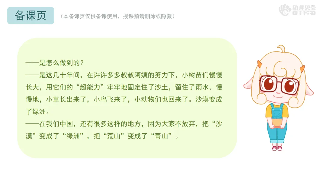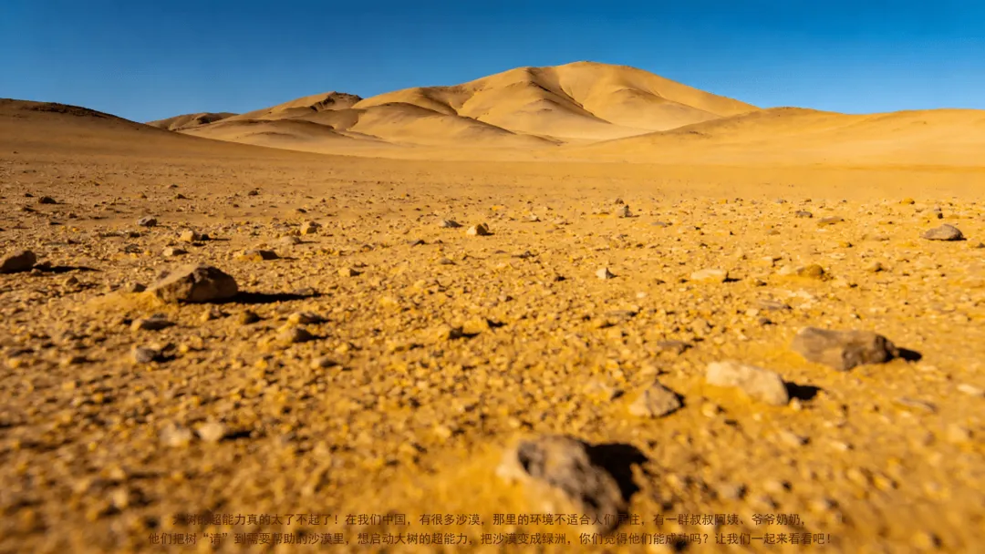 ——大树的超能力真的太了不起了!在我们中国,有很多沙漠,那里的环境不适合人们居住,有一群叔叔阿姨、爷爷奶奶,他们把树“请”到需要帮助的沙漠里,想启动大树的超能力,把沙漠变成绿洲,你们觉得他们能成功吗?让我们一起来看看吧!