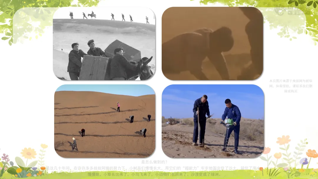 ——是这几十年间,在许许多多叔叔阿姨的努力下,小树苗们慢慢长大,用它们的“超能力”牢牢地固定住了沙土,留住了雨水。慢慢地,小草长出来了,小鸟飞来了,小动物们也回来了。沙漠变成了绿洲。