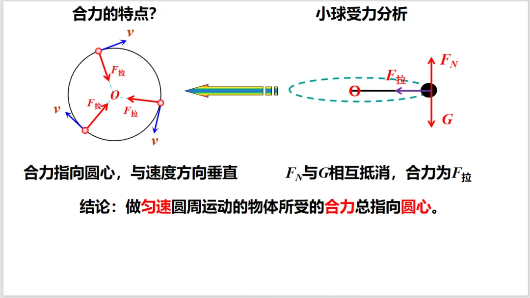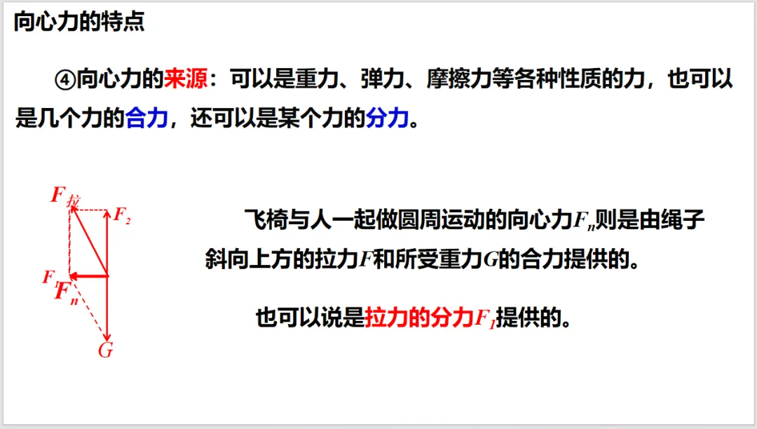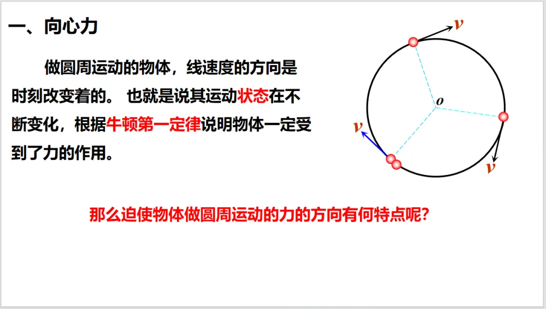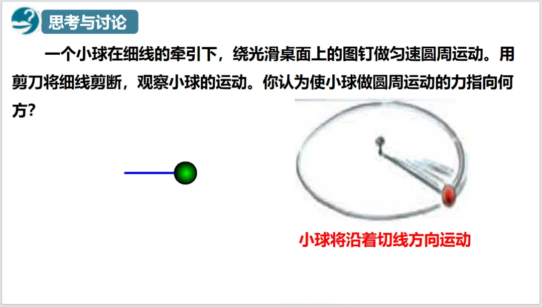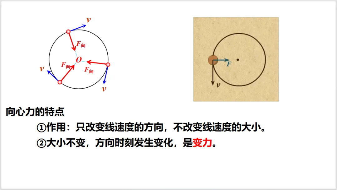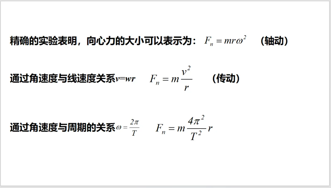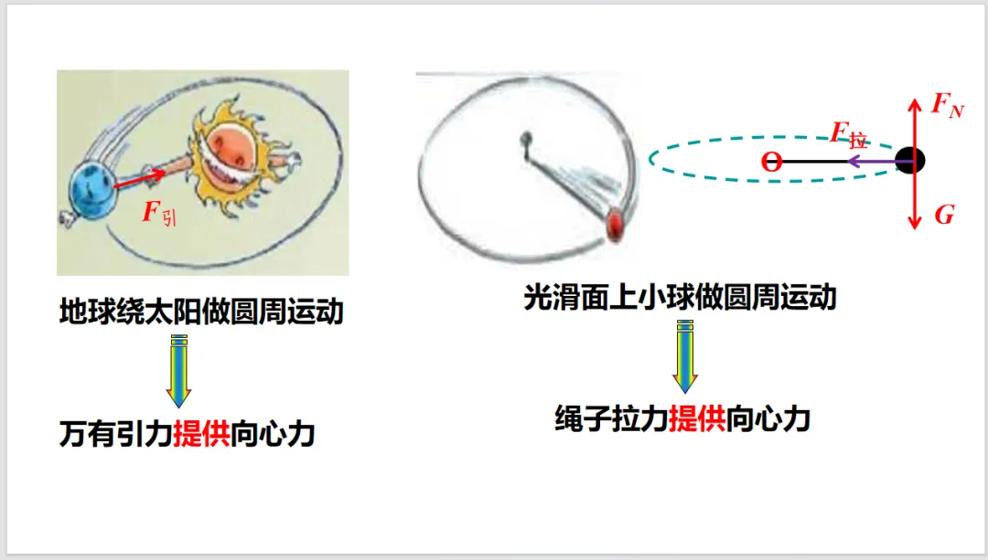 向心力是按效果命名的力,不是按性质命名的,这比较容易让学生混淆。所以课本先从生活中的现象出发,由牛顿定律引入向心力。使用生活中常见的物品来做实验(小球),可以减少由于器材引起的困难,确保实验顺利开展,也能使学生感到科学就在身边,拉近对科学的亲近感。分析小球的实验后,就可以得出向心力的概念。特别注意向心力的特性——效果命名的力。通过演示实验,直接给出表达式。再到一般的曲线运动,让学生领会普遍性原则。