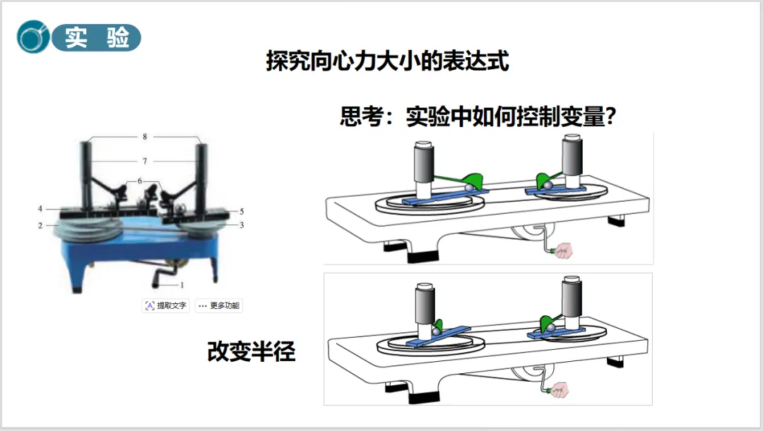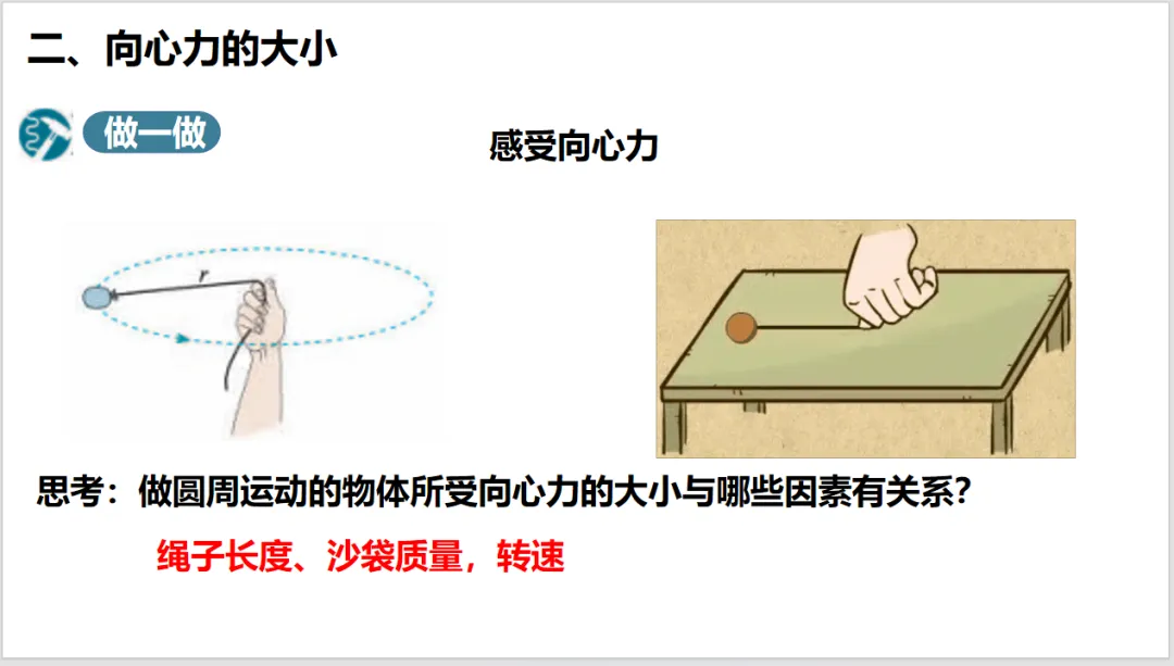 2、本课中让学生通过自己动手实验亲自感受拉力的变化,加强对向心力的理解。教学中应尽可能地让学生参与课题教学活动和课堂实验。但是感受向心力的实验具有一定危险,要注意把控。