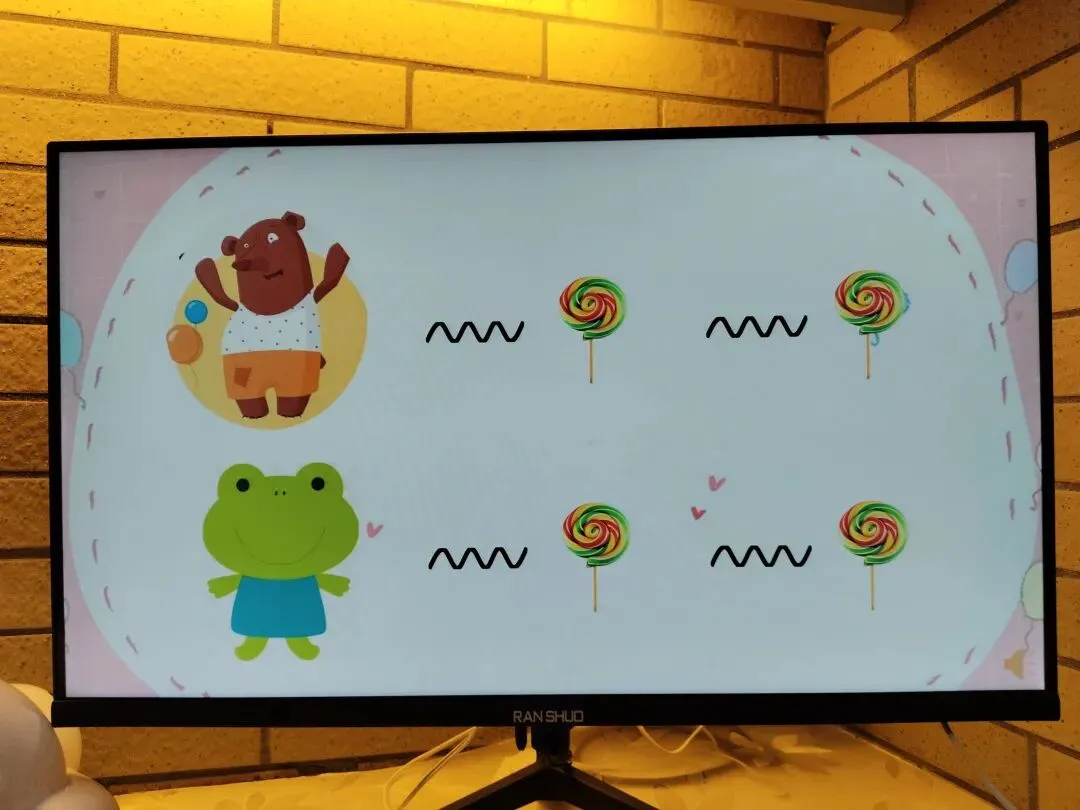 3. 师:有两个小动物也想出来和小朋友一起吃棒棒糖,我们看看是谁PPT-3(幼儿看图回答:小熊、小青蛙)