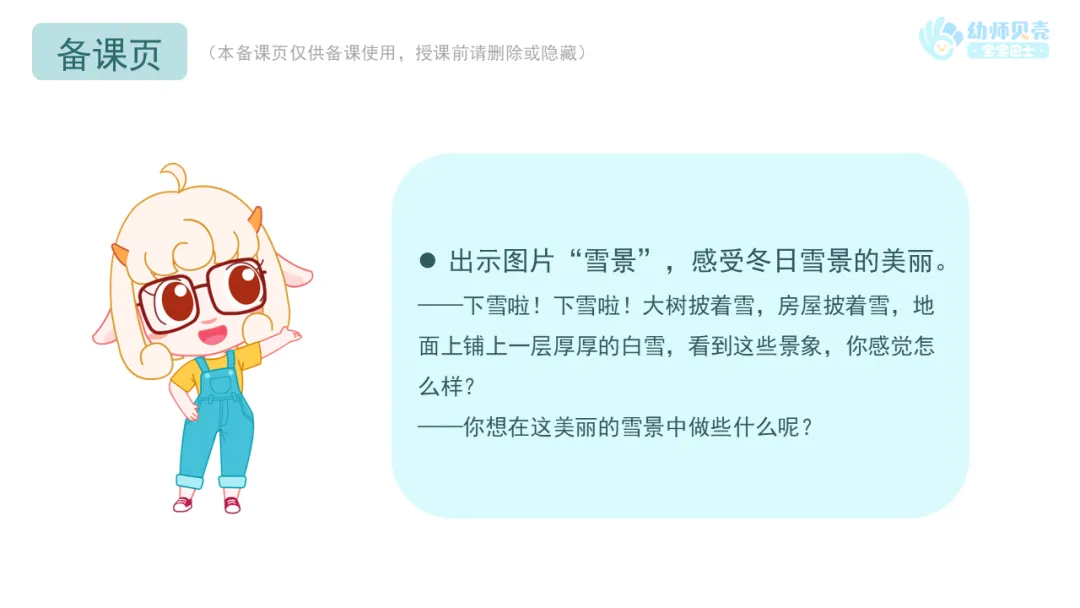 l课件准备:“雪景”图片;“雪地上的脚印”图片;《雪地里的小画家》诗歌音频及图片;“谁的画”图片。