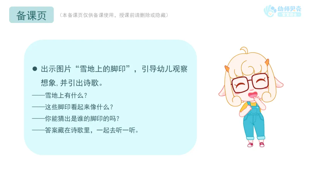 l出示图片“雪地上的脚印”,引导幼儿观察想象,并引出诗歌。