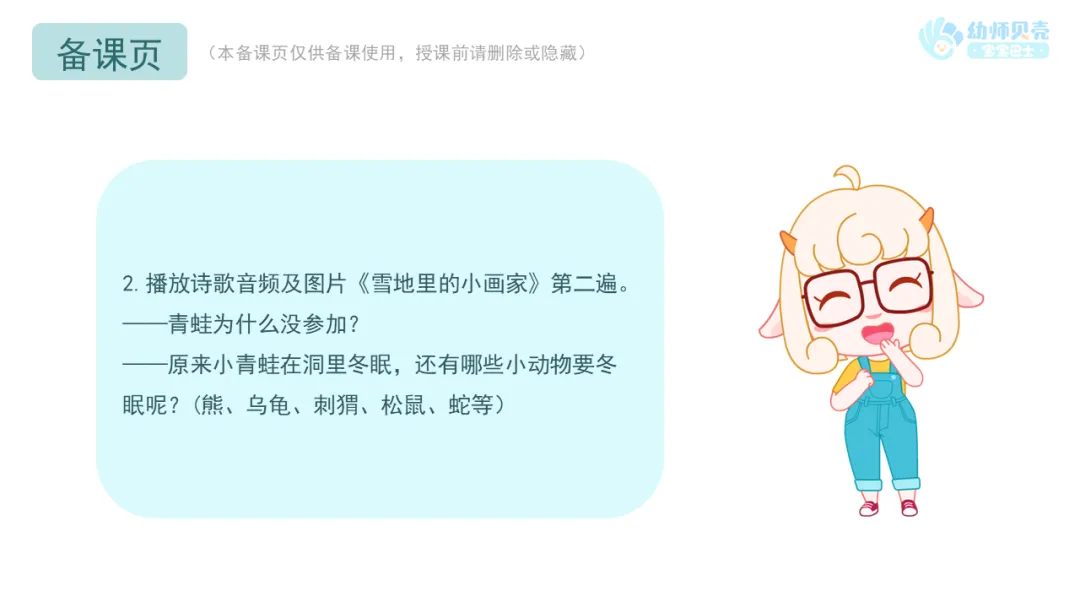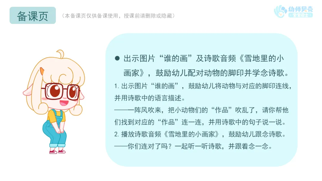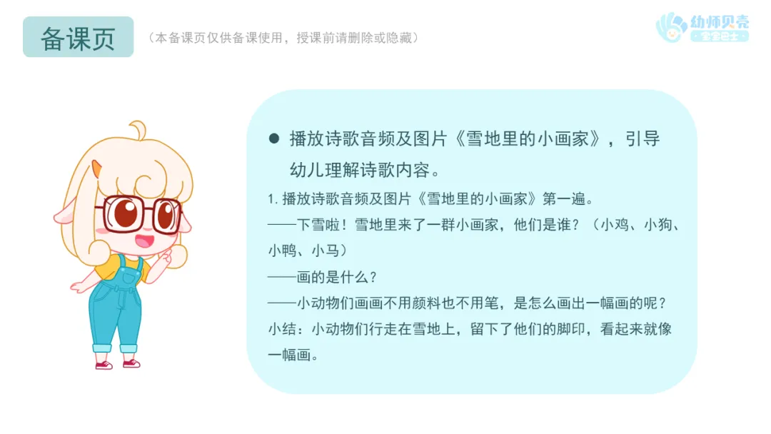 2.播放诗歌音频及图片《雪地里的小画家》第二遍。