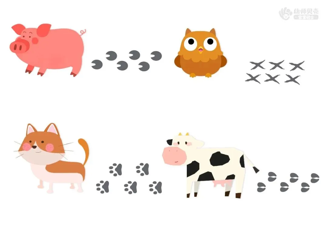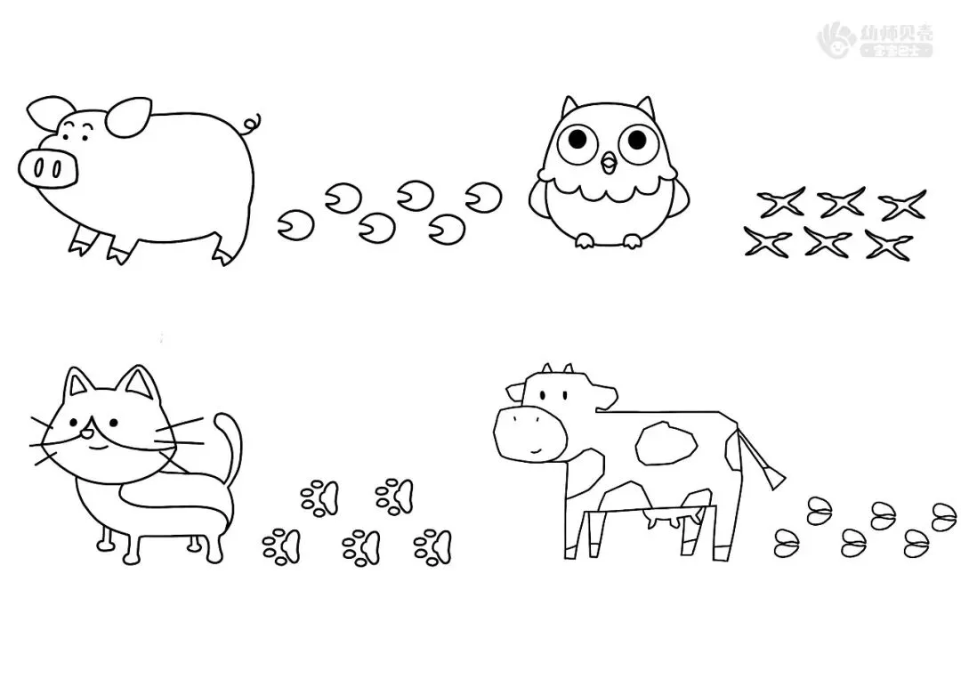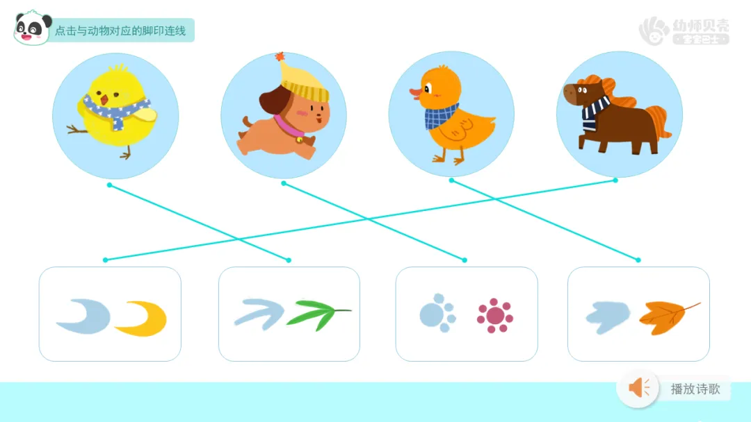 1.出示图片“谁的画”,鼓励幼儿将动物与对应的脚印连线,并用诗歌中的语言描述。