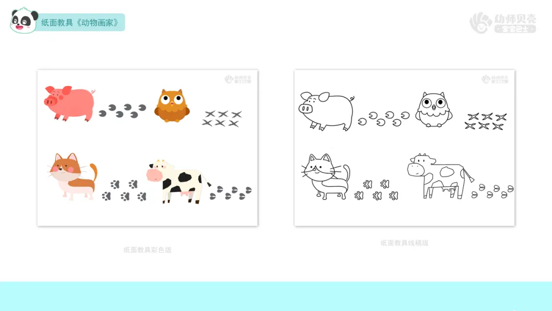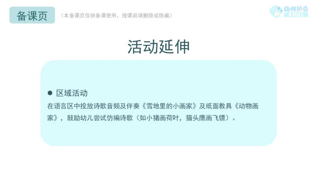 在语言区中投放诗歌音频及伴奏《雪地里的小画家》及纸面教具《动物画家》,鼓励幼儿尝试仿编诗歌。