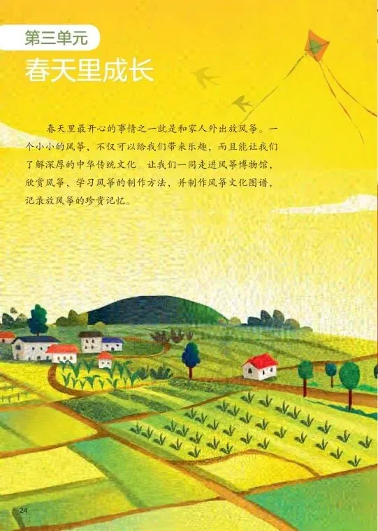 本单元以“春天”和“风筝”为载体,通过“制作—绘制—记录”的递进线索,引导学生走进中华传统风筝文化,体验从设计到放飞的全过程。单元从风筝的起源、造型、功能入手,让学生了解风筝“扎、糊、绘、放”四艺,并亲手扎制风筝骨架;进而学习风筝图案的寓意与绘制方法,完成彩绘创作;最后通过制作风筝文化图谱、记录放风筝的场景,将个人体验升华为文化理解。教材内容涵盖传统风筝造型、吉祥图案、《南鹞北鸢考工志》等文化资源,让学生在动手实践中感受劳动人民的智慧,体会“工匠精神”的内涵。本单元落实了《艺术课程标准》中关于“设计应用”“综合探索”领域的要求,引导学生用多种媒材进行创意实践,发展综合能力,增强对中华优秀传统文化的认同感。