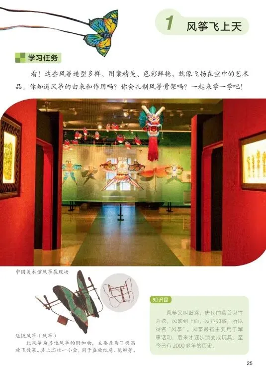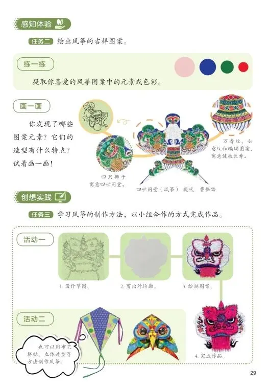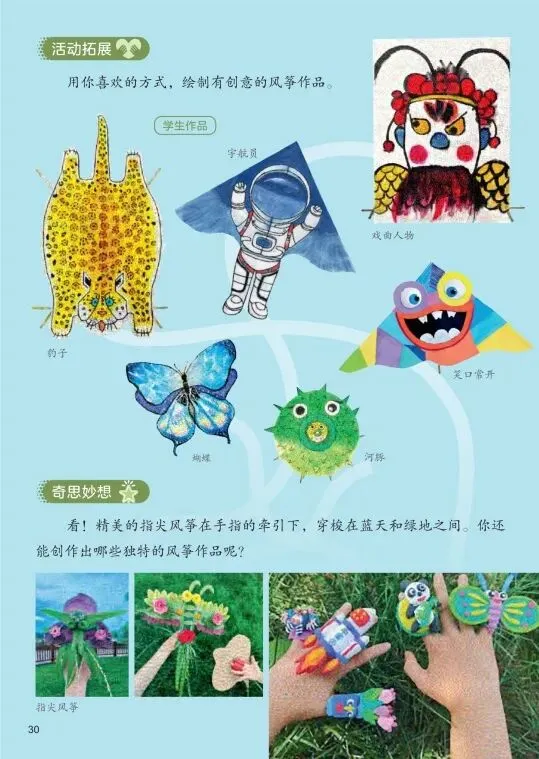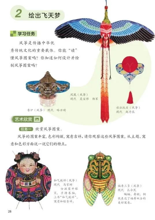 艺术表现:学习风筝“扎、糊、绘”的基本技法,能用线条、色彩设计绘制风筝图案,表现自己的创意。