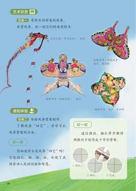 本课是单元的起始课,以“风筝的由来和作用”为引,引导学生了解风筝的历史与种类,重点学习风筝“四艺”中的“扎”与“糊”。教材展示了多种传统风筝造型(如送饭风筝等),并提供了扎制步骤图。基本问题聚焦于“如何扎制风筝骨架”。核心知识与技能包括:了解风筝的结构(骨架、蒙面、提线),学习竹篾的弯折与绑扎技巧,掌握糊纸面的方法。价值引导在于让学生体会“扎、糊、绘、放”四艺中蕴含的劳动智慧,初步感受工匠精神。