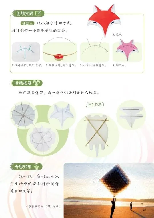 创意实践:综合运用多种材料和表现手法,完成风筝制作、图案绘制和记录作品,发展动手能力与创新意识。