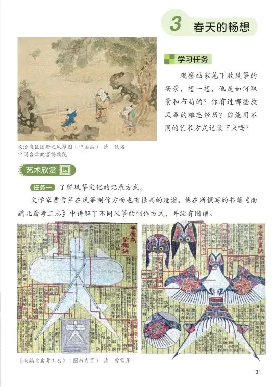 本课是单元的总结拓展课,引导学生从风筝的制作与绘制走向文化记录与创意表达。教材以《欢洽寰区图册之风筝图》和《南鹞北鸢考工志》为欣赏素材,启发学生了解风筝文化的记录方式。基本问题聚焦于“如何用艺术的方式记录放风筝的美好记忆”。核心知识与技能包括:学习用图文结合的方式记录风筝的构成、制作过程或放风筝场景,掌握草图绘制、元素提取、文字撰写、组合装订的方法。价值引导在于培养学生的综合表达能力,体会艺术记录生活的意义。