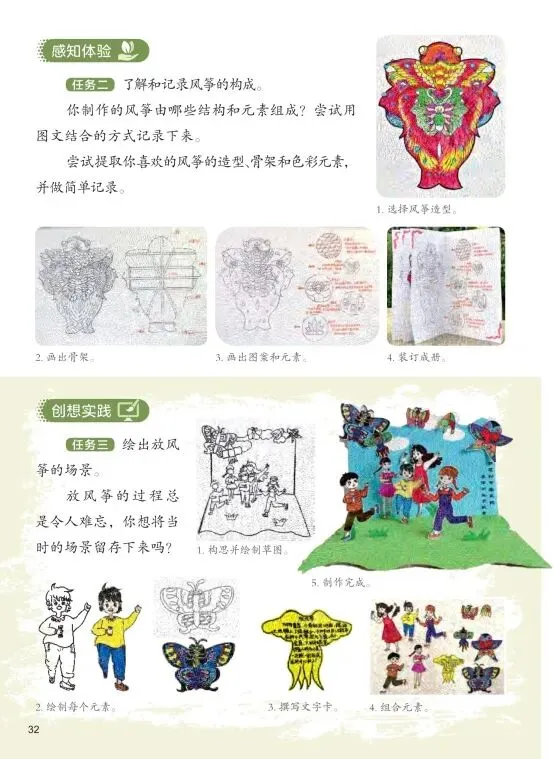 在“我的风筝故事”创作活动中,通过构思草图、提取元素、文字撰写、组合装订的过程,发展综合表达能力与创意思维。