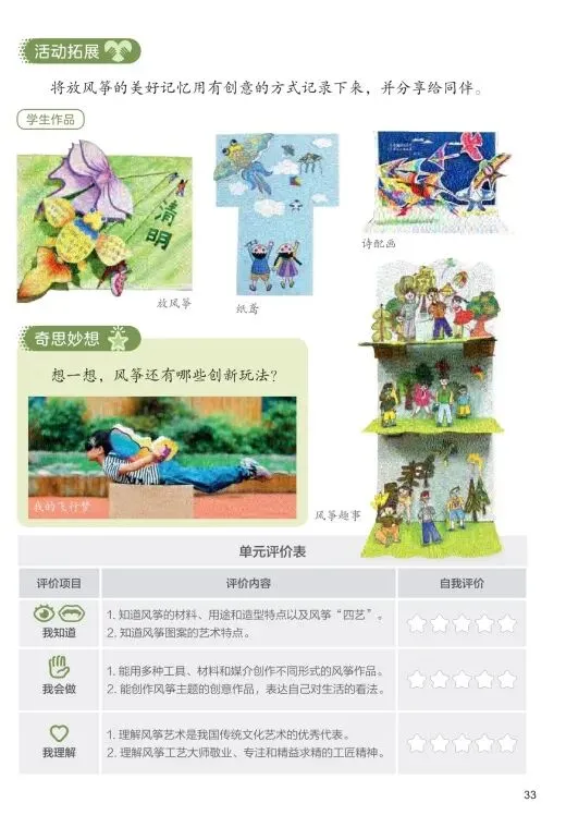 完成一本《我的风筝故事》小册子,包含:单元学习心得、三件作品的创作过程与设计思路、收集的风筝文化知识、一次真实的放风筝体验记录(或想象)。
