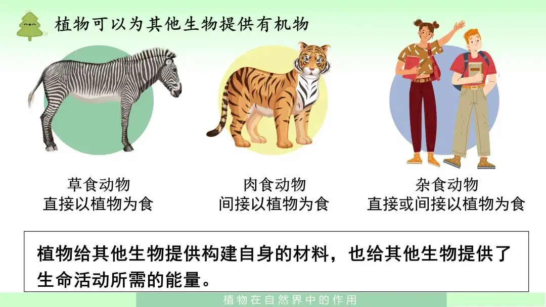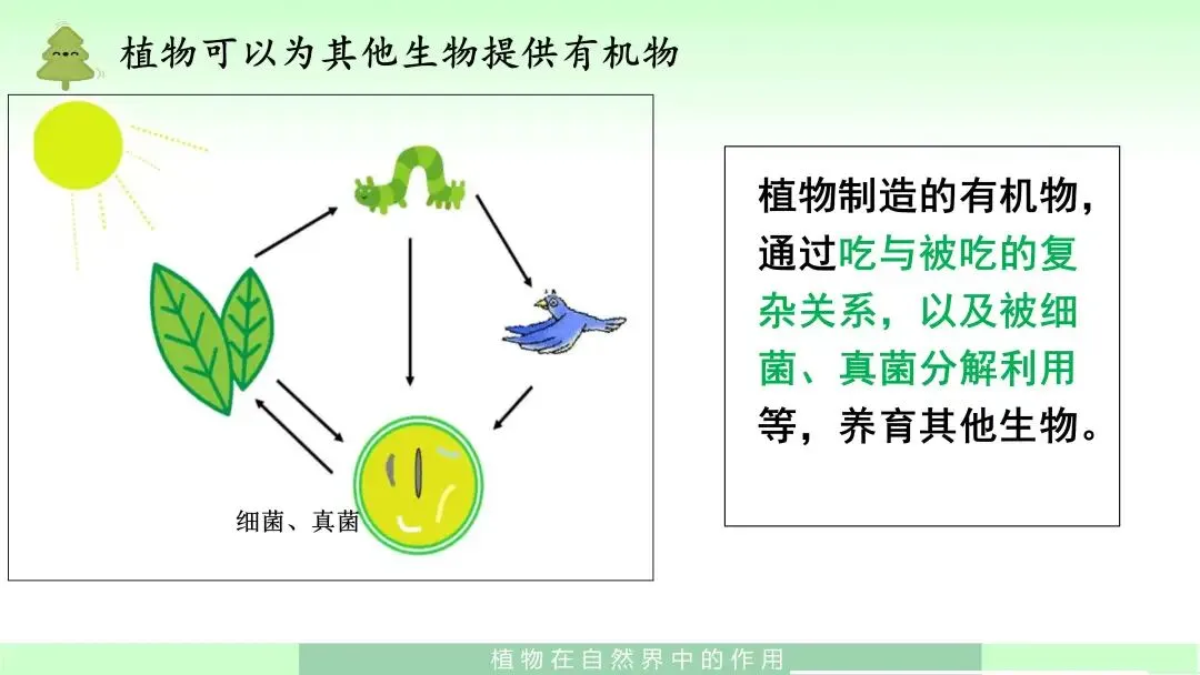 课件先展示了草食动物、肉食动物和杂食动物与植物之间的关系,强调植物给其他生物提供构建自身的材料,也提供生命活动所需的能量。随后又通过“吃与被吃”的关系以及细菌、真菌分解利用的图示,进一步说明植物制造的有机物养育着其他生物。