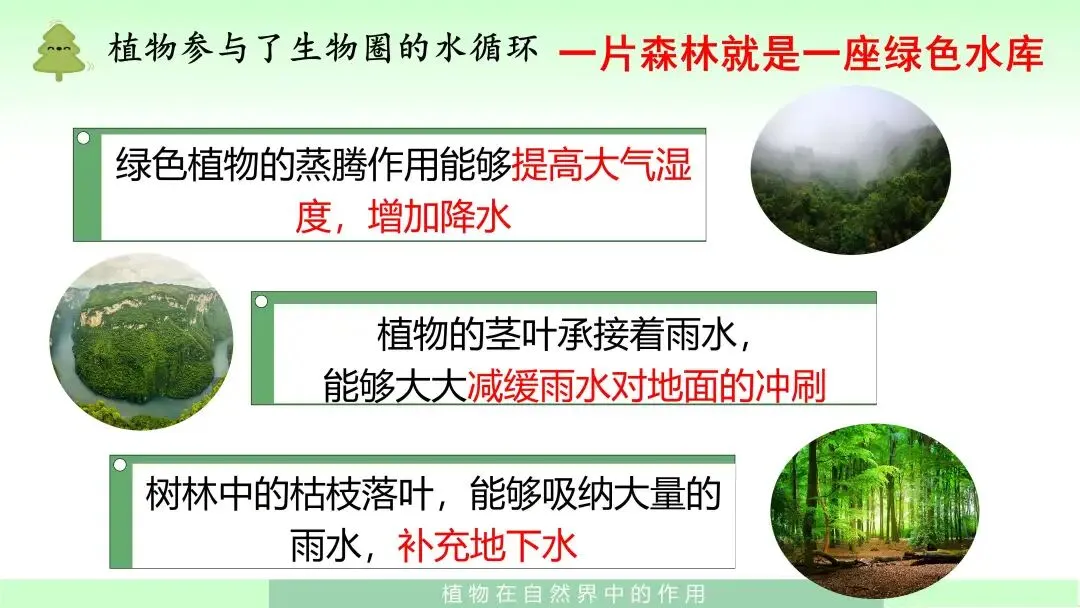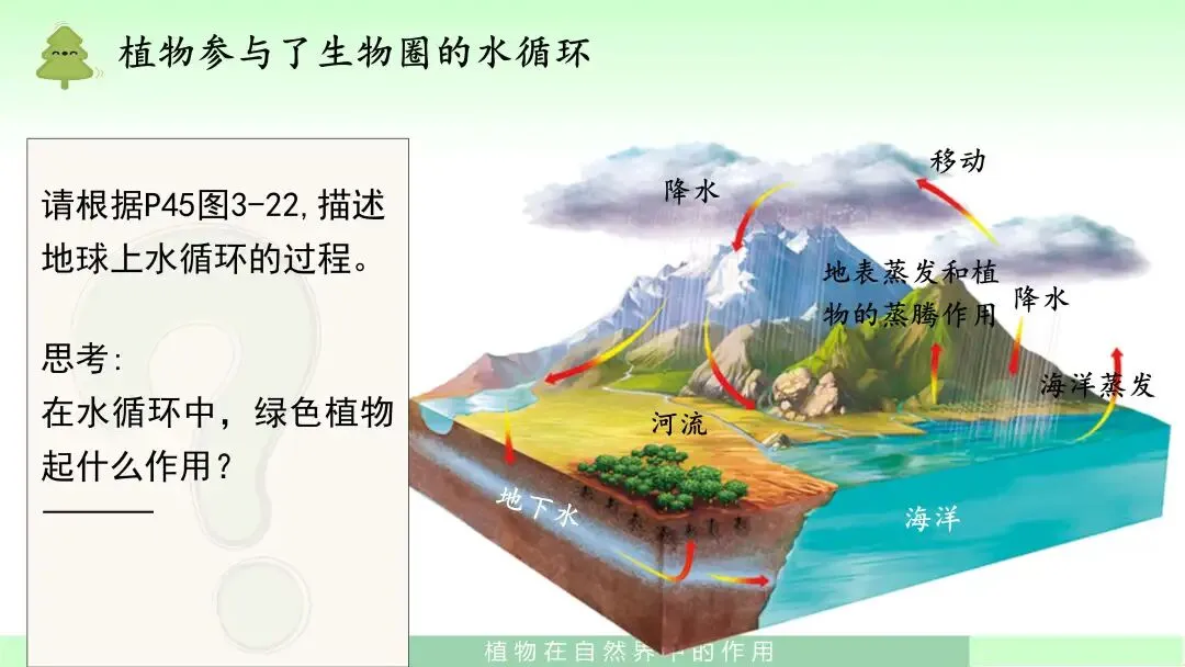 通过图文结合和问题引导,帮助学生理解植物不仅参与水循环,而且在涵养水源、保持水土、调节气候方面具有重要作用。