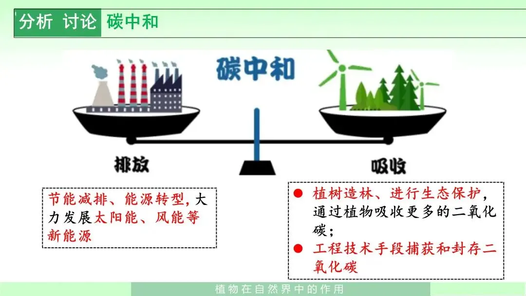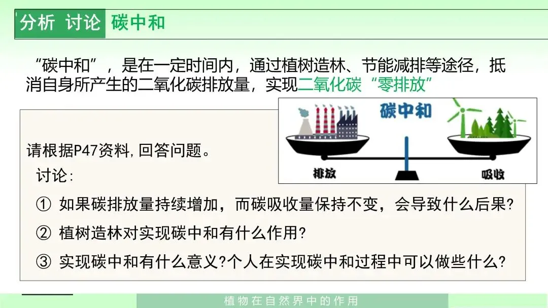 难点难点在于帮助学生从“单个知识点”上升到“生物圈整体联系”的层面,真正理解植物为什么是自然界中极其重要的一类生物;同时,引导学生将课本知识与“碳中和”“绿色出行”“植树造林”等现实行动建立联系。课件后半部分关于碳中和的讨论内容,正好可以作为突破难点的重要抓手。