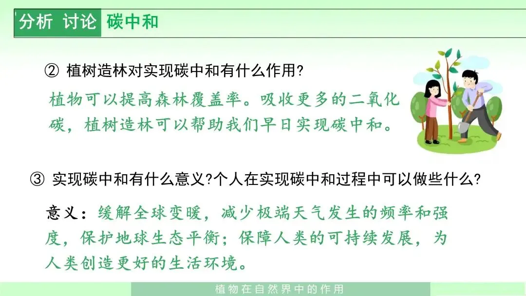 我会围绕“碳中和”或“绿色生活”设置讨论问题。例如:如果碳排放不断增加,而植物吸收二氧化碳的能力没有明显提高,会造成什么影响?植树造林为什么有助于改善环境?在日常生活中,我们可以做些什么来保护植物、保护环境?