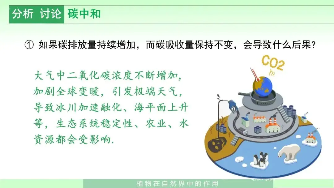 课件通过光合作用、呼吸作用、燃烧等过程之间的关系图,说明绿色植物通过光合作用不断消耗大气中的二氧化碳,并将氧气排放到大气中,从而维持生物圈中二氧化碳和氧气的相对平衡。随后课件又联系现实,指出二氧化碳浓度增加会加剧温室效应,并引出“碳中和”问题。