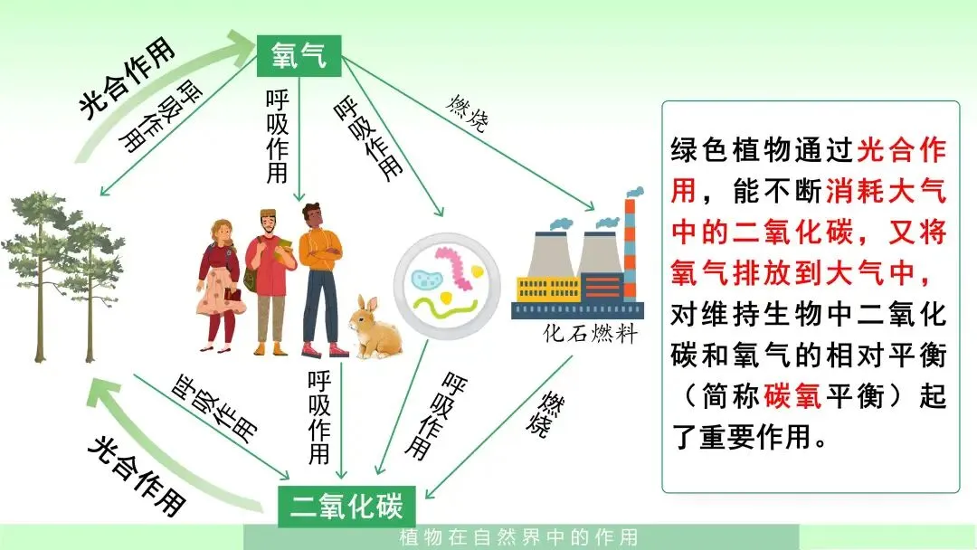 这一部分我会先帮助学生回顾光合作用和呼吸作用,再引导他们理解:“为什么说植物是维持碳氧平衡的重要力量?”“如果大气中二氧化碳不断增加,会带来什么后果?”