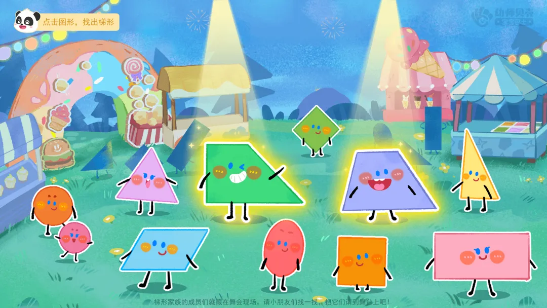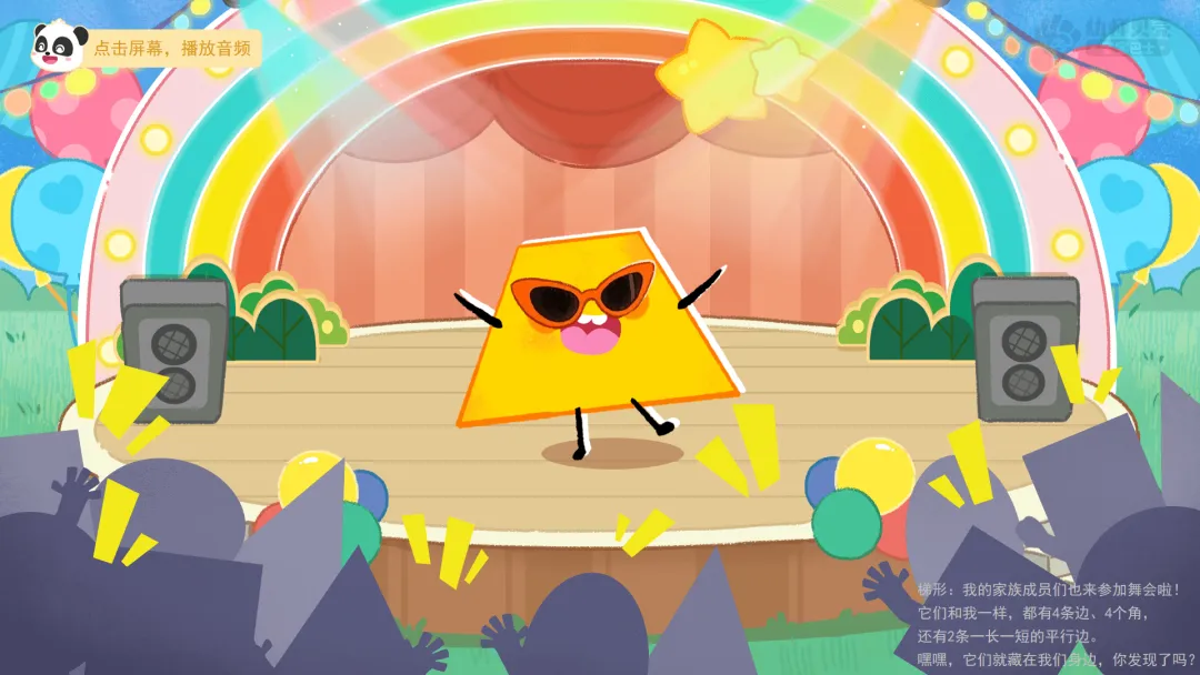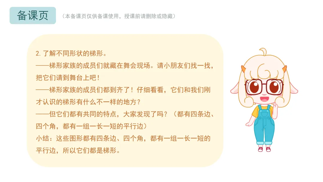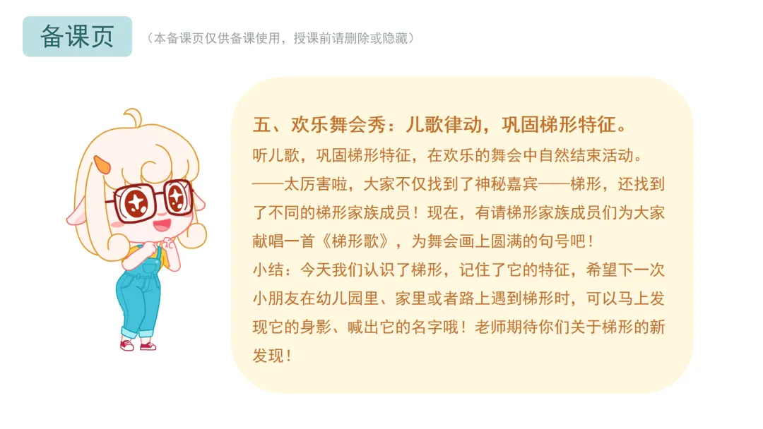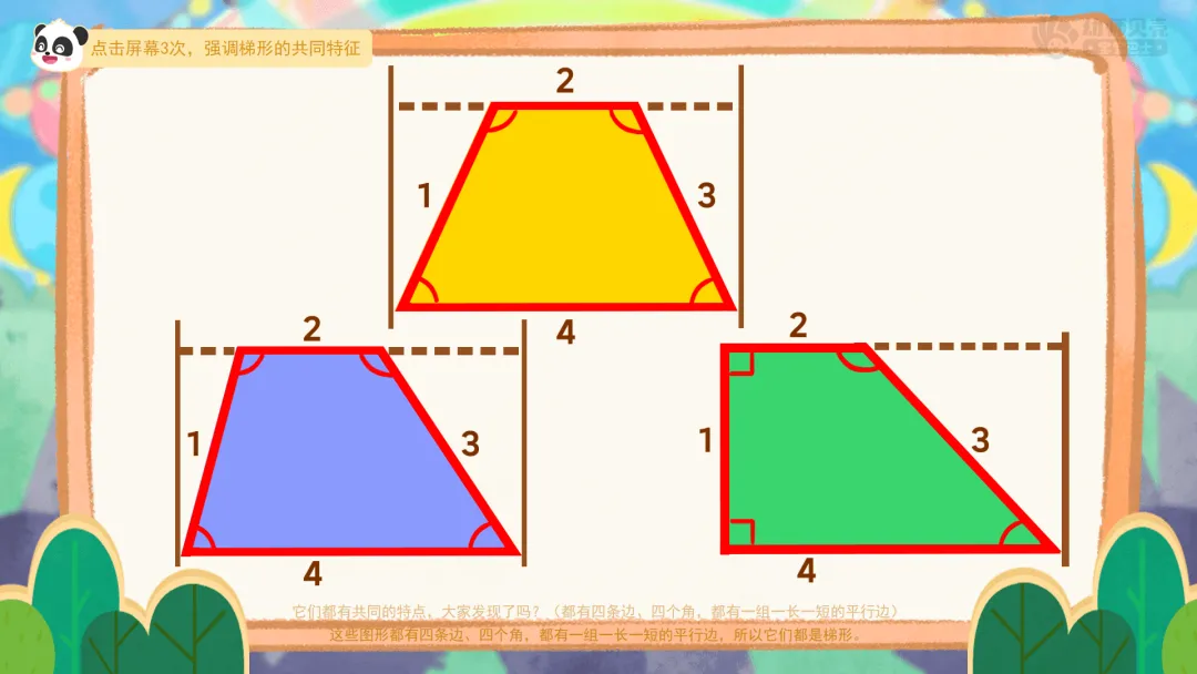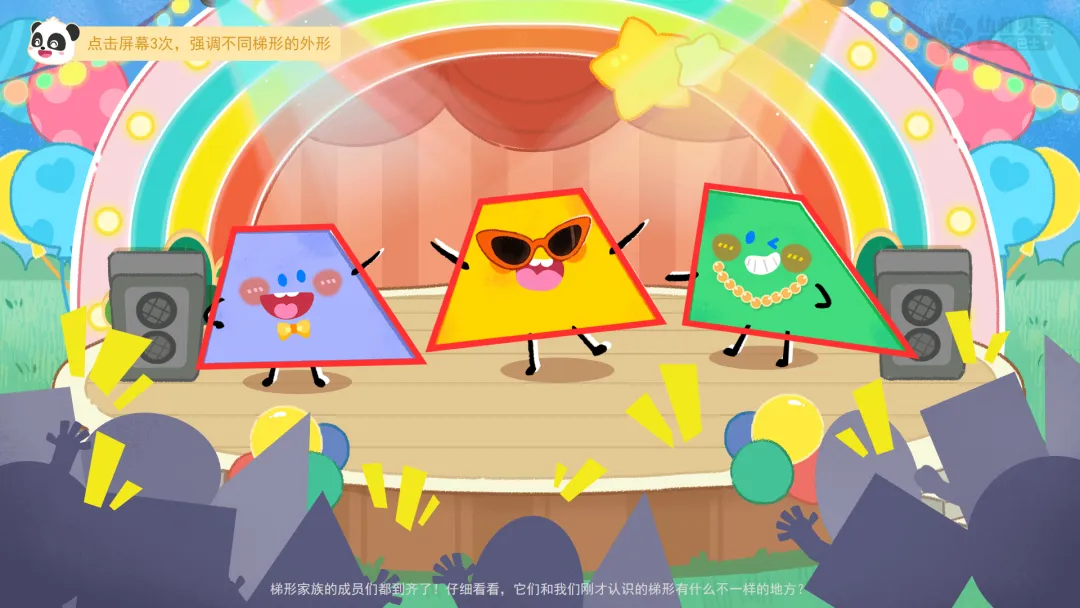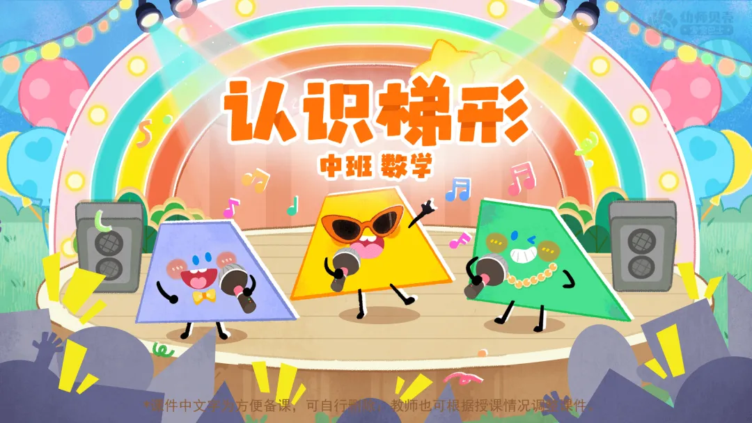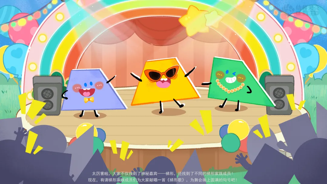 ——太厉害啦,大家不仅找到了神秘嘉宾——梯形,还找到了不同的梯形家族成员!现在,有请梯形家族成员们为大家献唱一首《梯形歌》,为舞会画上圆满的句号吧!