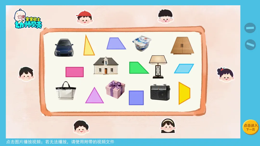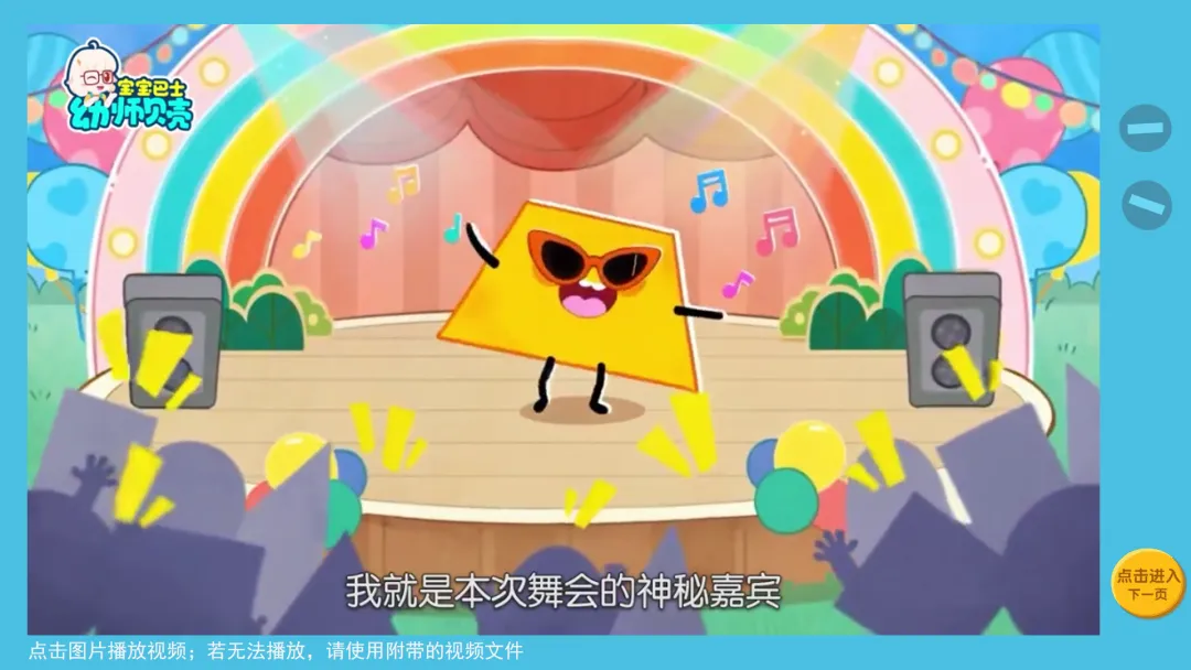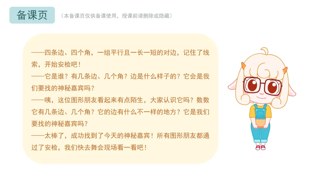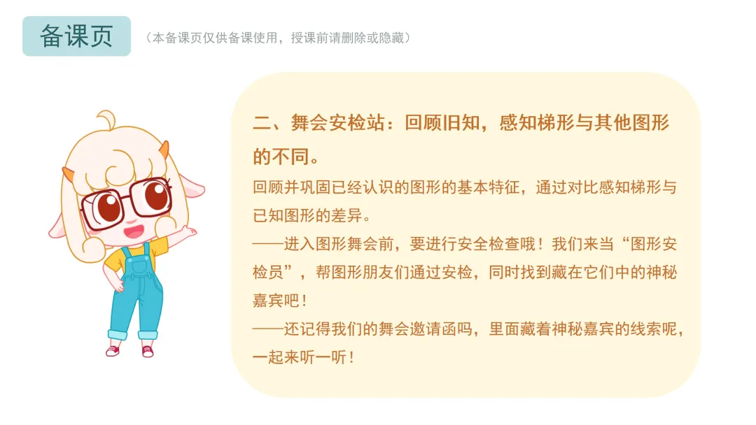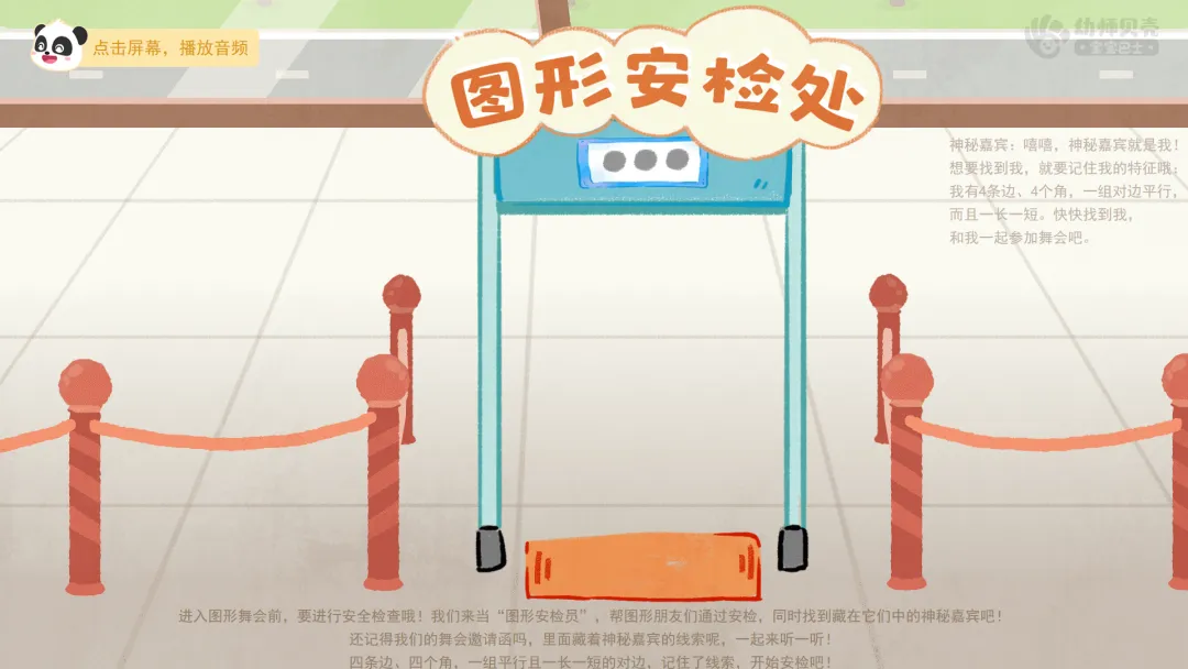 ——进入图形舞会前,要进行安全检查哦!我们来当“图形安检员”,帮图形朋友们通过安检,同时找到藏在它们中的神秘嘉宾吧!