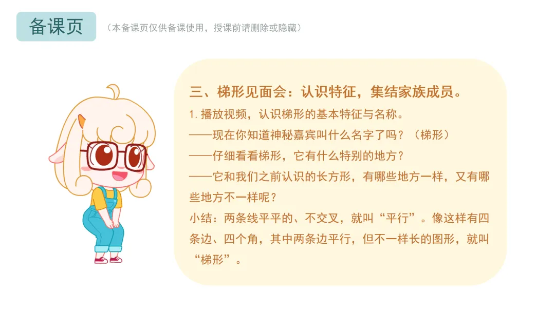 l难点:能不受大小、颜色、摆放方向的影响,根据梯形特征辨认不同的梯形。