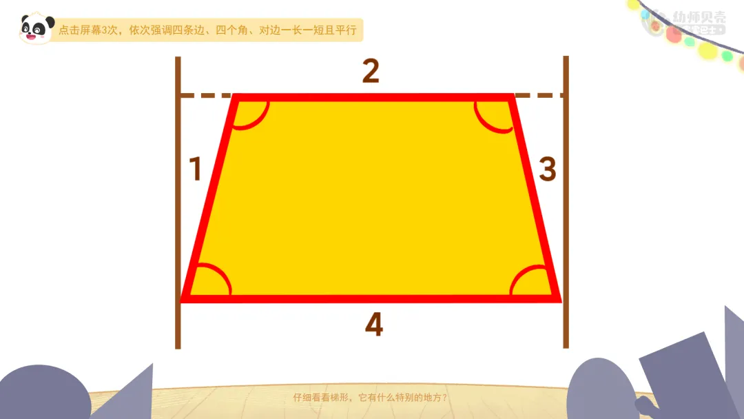 小结:这些梯形都有四条边、四个角,和一组一长一短的平行边。只要记住这个特征,不管梯形怎么“藏”,我们都能发现它!
