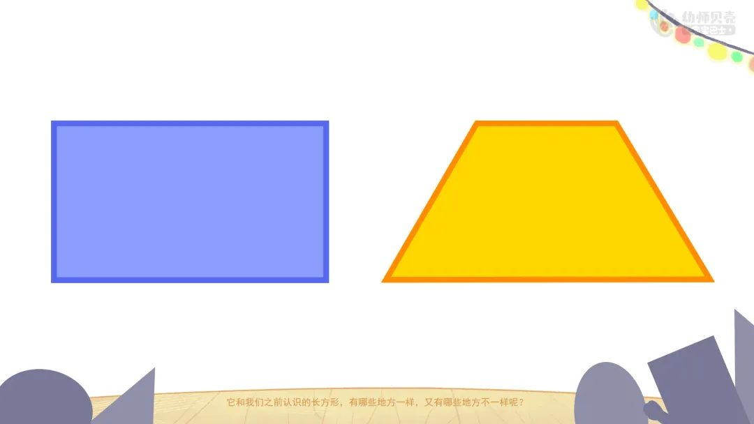 ——但它们都有共同的特点,大家发现了吗?(都有四条边、四个角,都有一组一长一短的平行边)
