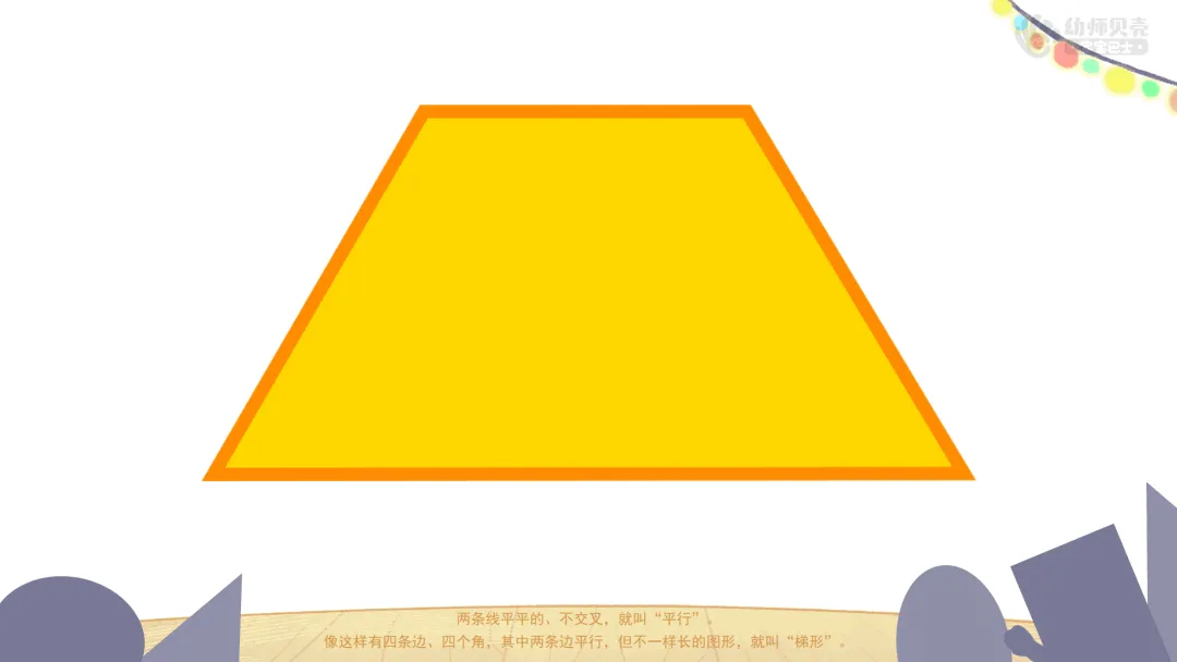 小结:两条线平平的、不交叉,就叫“平行”。像这样有四条边、四个角,其中两条边平行,但不一样长的图形,就叫“梯形”。