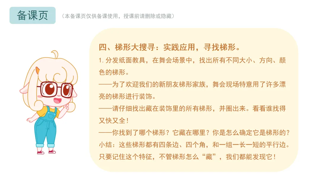 1.分发纸面教具,在舞会场景中,找出所有不同大小、方向、颜色的梯形。
