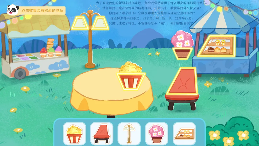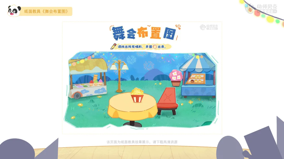 ——梯形家族的成员们就藏在舞会现场。请小朋友们找一找,把它们请到舞台上吧!
