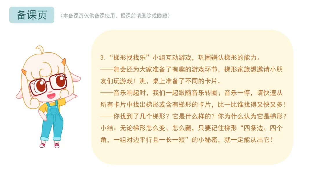 ——舞会还为大家准备了有趣的游戏环节,梯形家族想邀请小朋友们玩游戏!瞧,桌上准备了不同的卡片。