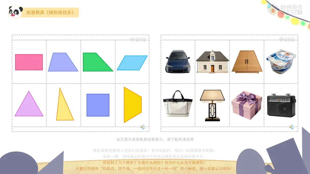 l纸面教具:《舞会布置图》《梯形找找乐》。