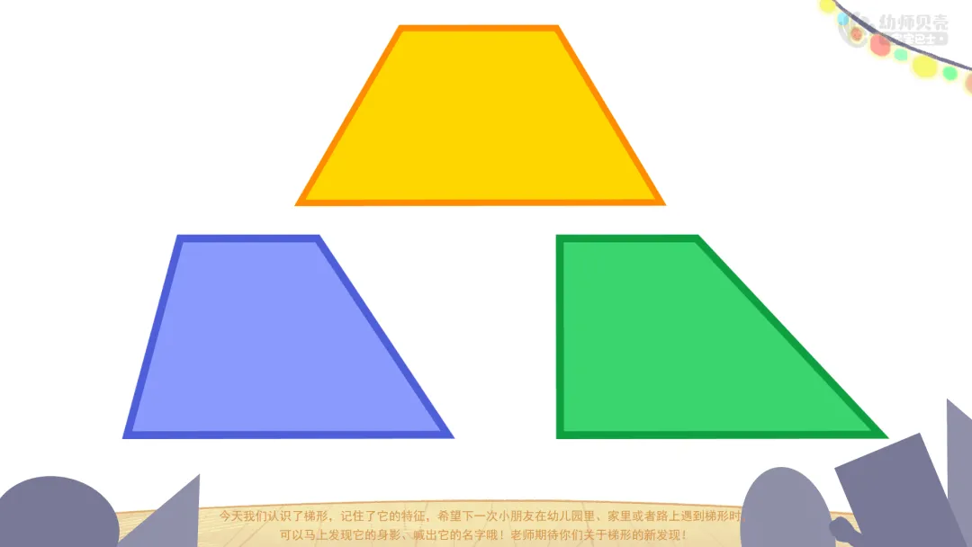 小结:今天我们认识了梯形,记住了它的特征,希望下一次小朋友在幼儿园里、家里或者路上遇到梯形时,可以马上发现它的身影、喊出它的名字哦!老师期待你们关于梯形的新发现!