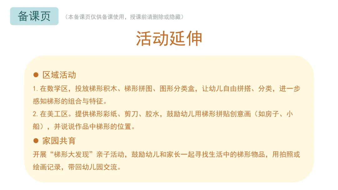 开展“梯形大发现”亲子活动,鼓励幼儿和家长一起寻找生活中的梯形物品,用拍照或绘画记录,带回幼儿园交流。