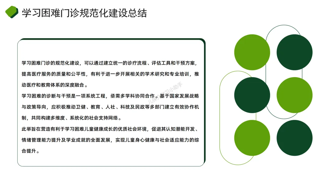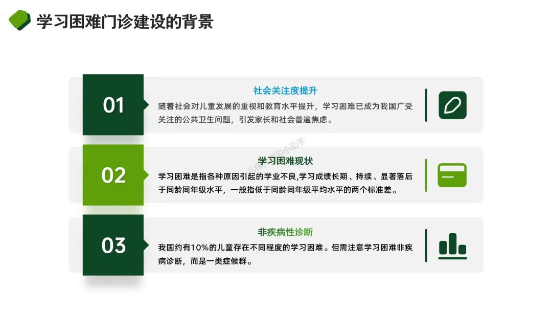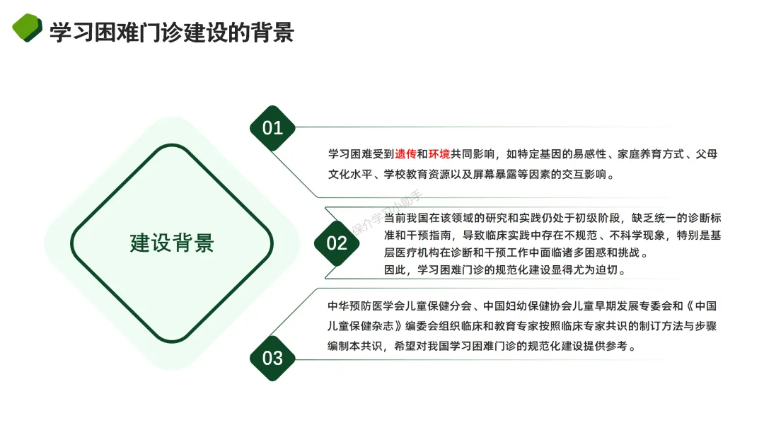 当前我国在该领域的研究和实践仍处于初级阶段,缺乏统一的诊断标准和干预指南,导致临床实践中存在不规范、不科学现象,特别是基层医疗机构在诊断和干预工作中面临诸多困惑和挑战。因此,学习困难门诊的规范化建设显得尤为迫切。